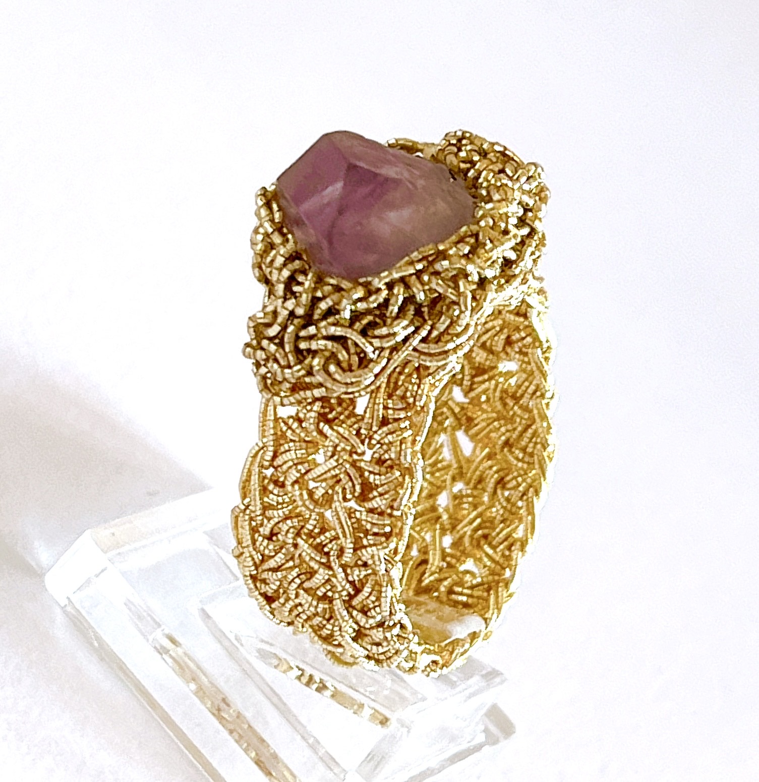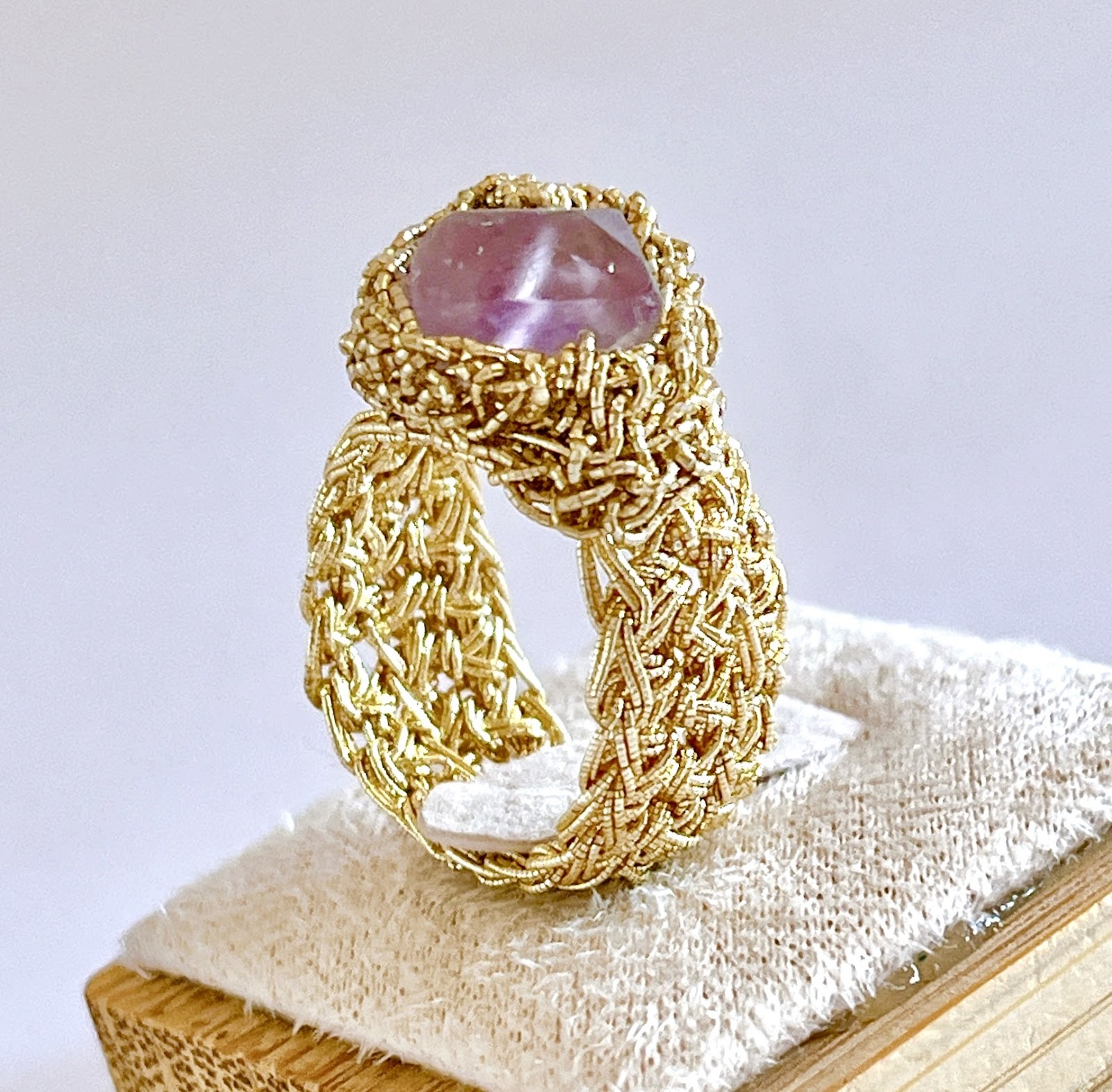 Anillo tejido a mano con hilo de algodón laminado en lamé dorado, con una amatista natural como protagonista. Su forma orgánica y textura envolvente evocan calma, fuerza interior y conexión con lo esencial.