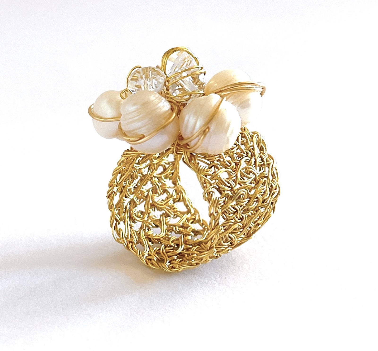 Anillo tejido a mano con alambre de cobre con baño de oro de 14K, coronado por perlas de río y cristales que evocan pureza y sofisticación.Las perlas aportan luz y elegancia atemporal, mientras los cristales reflejan destellos sutiles que embellecen cada gesto.