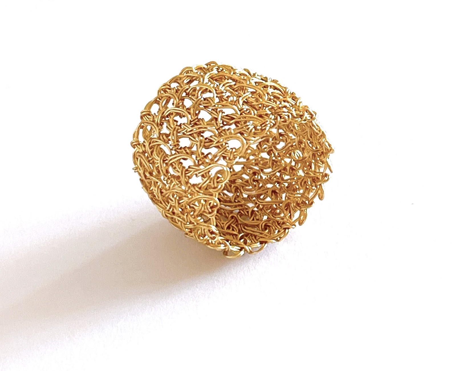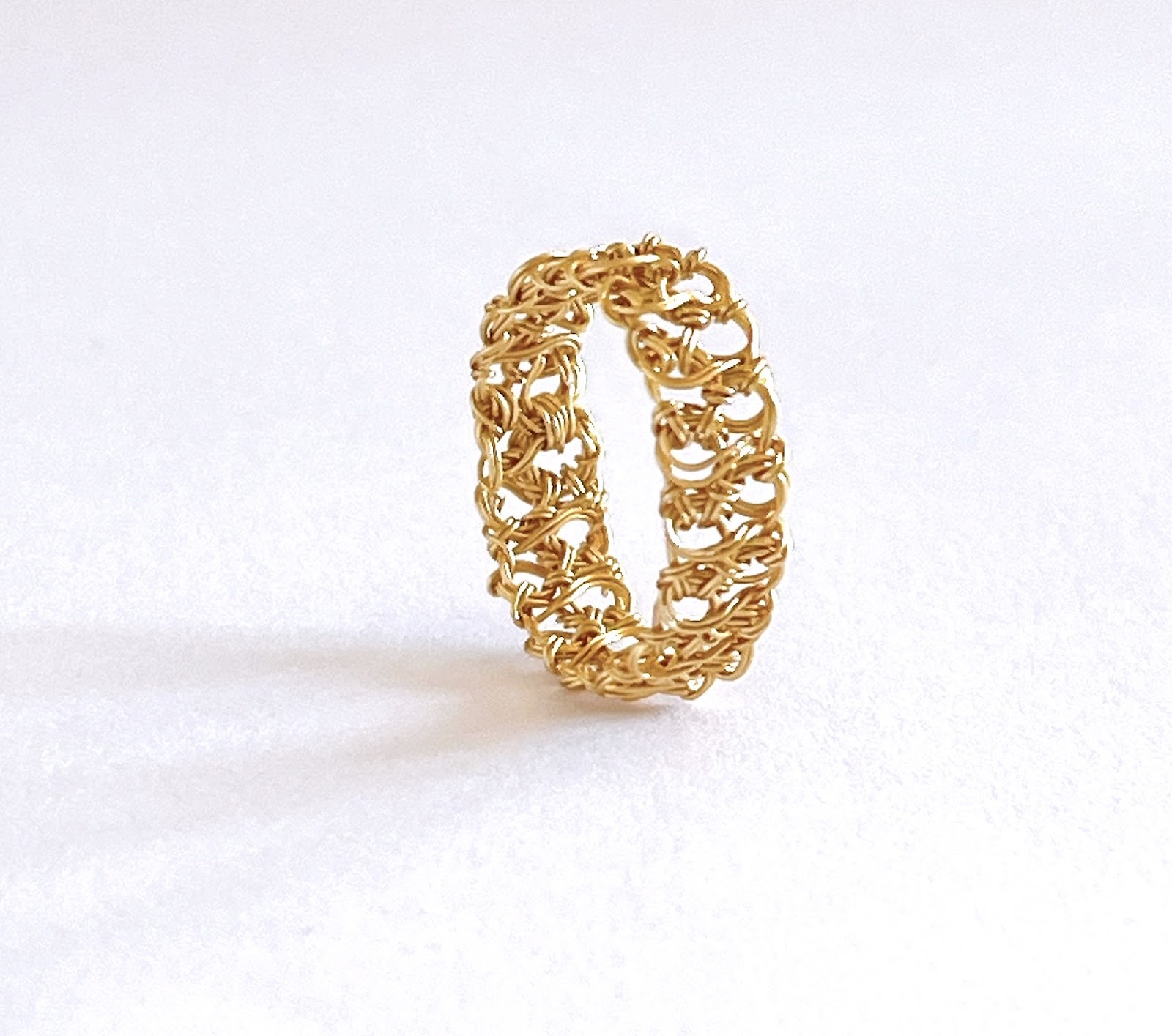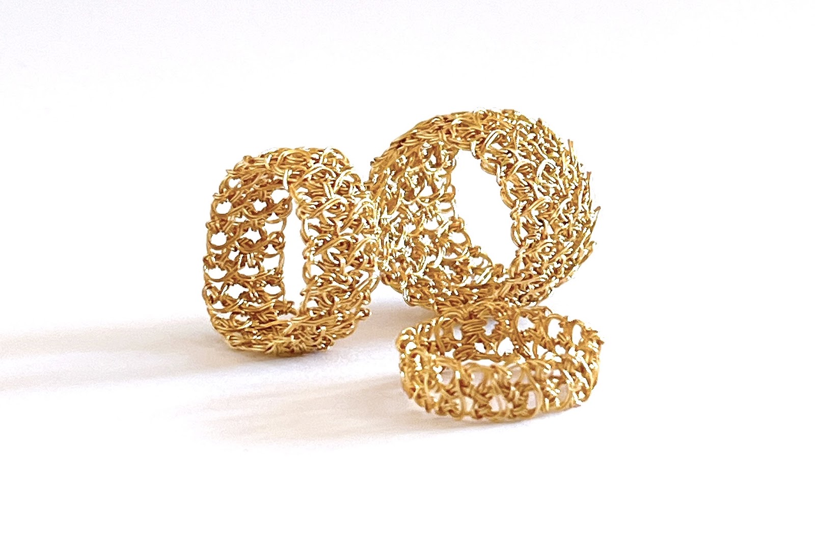 Anillos tejidos a mano con cobre bañado en oro de 14K, reflejan una geometría suave y orgánica que abraza el dedo con ligereza.