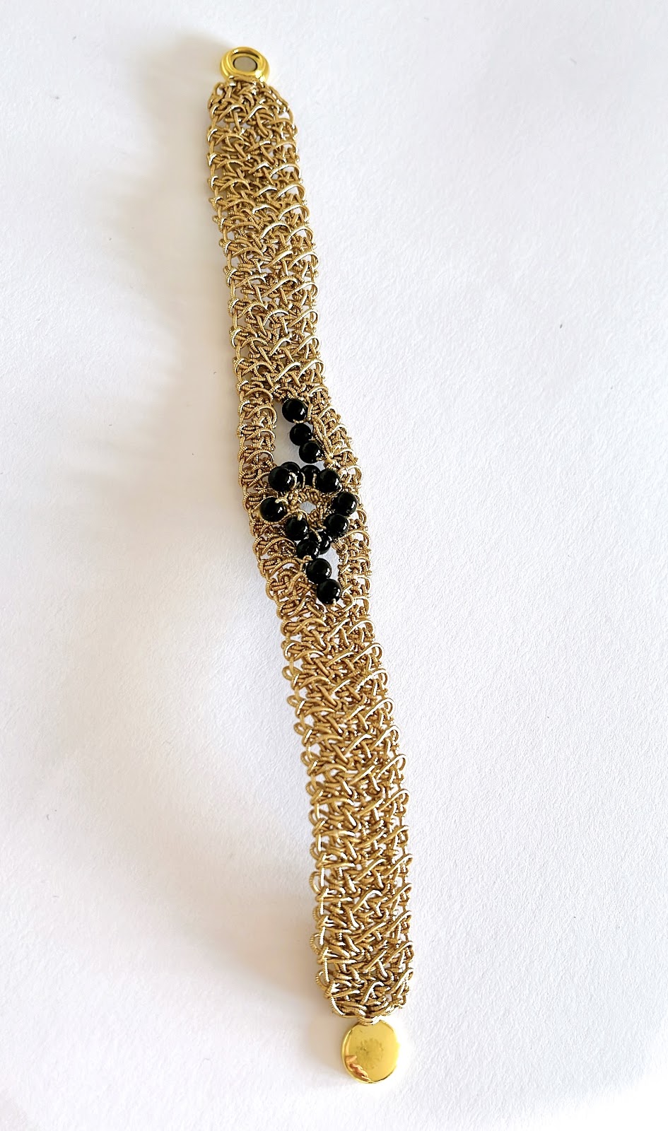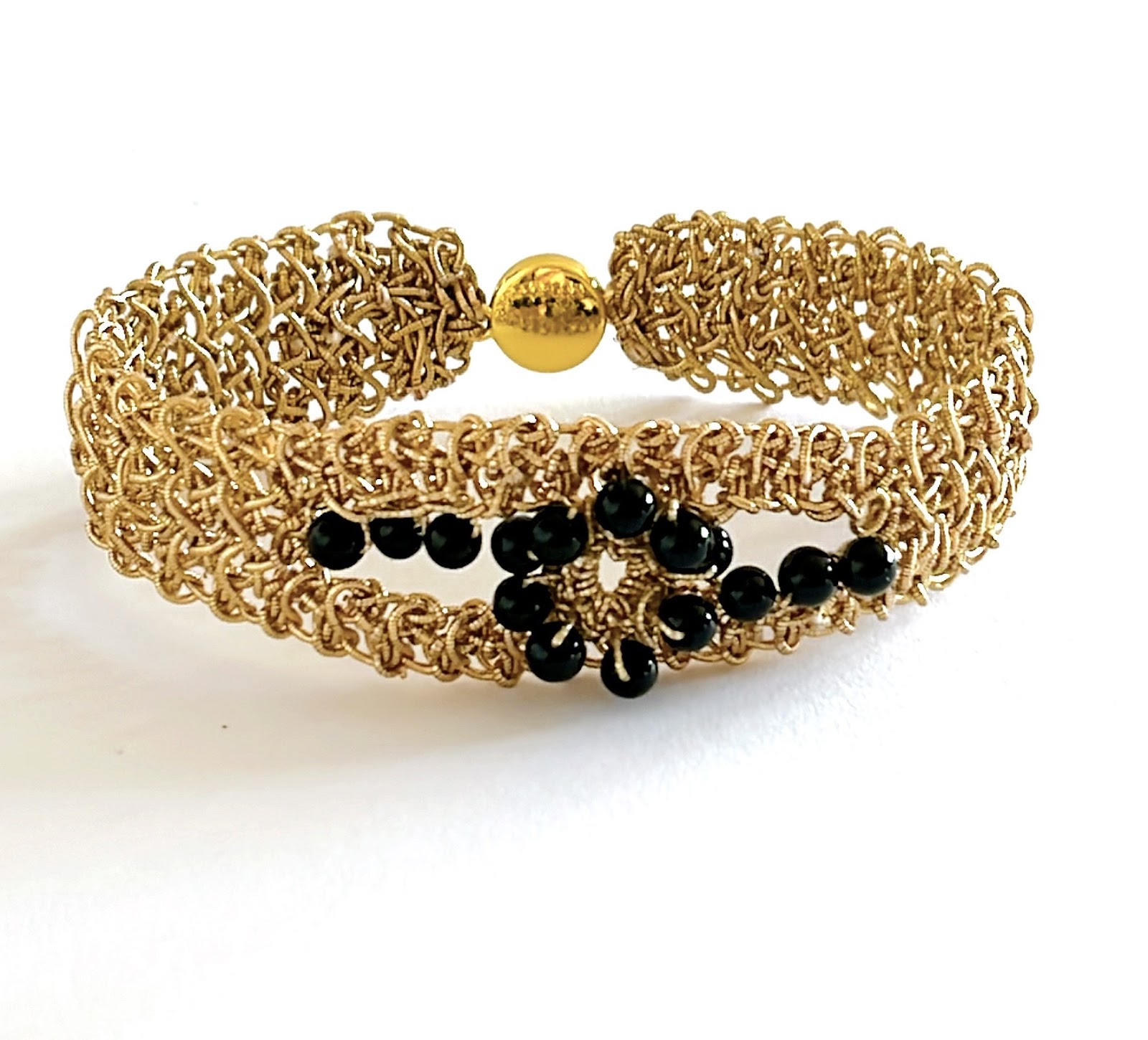 Diseñado para acompañarte en momentos especiales o cotidianos con distinción. Este brazalete combina la delicadeza del tejido a mano con la fuerza del contraste entre el dorado y el negro. Cada cuenta fue incorporada con precisión para formar un dibujo central con carácter y elegancia.
