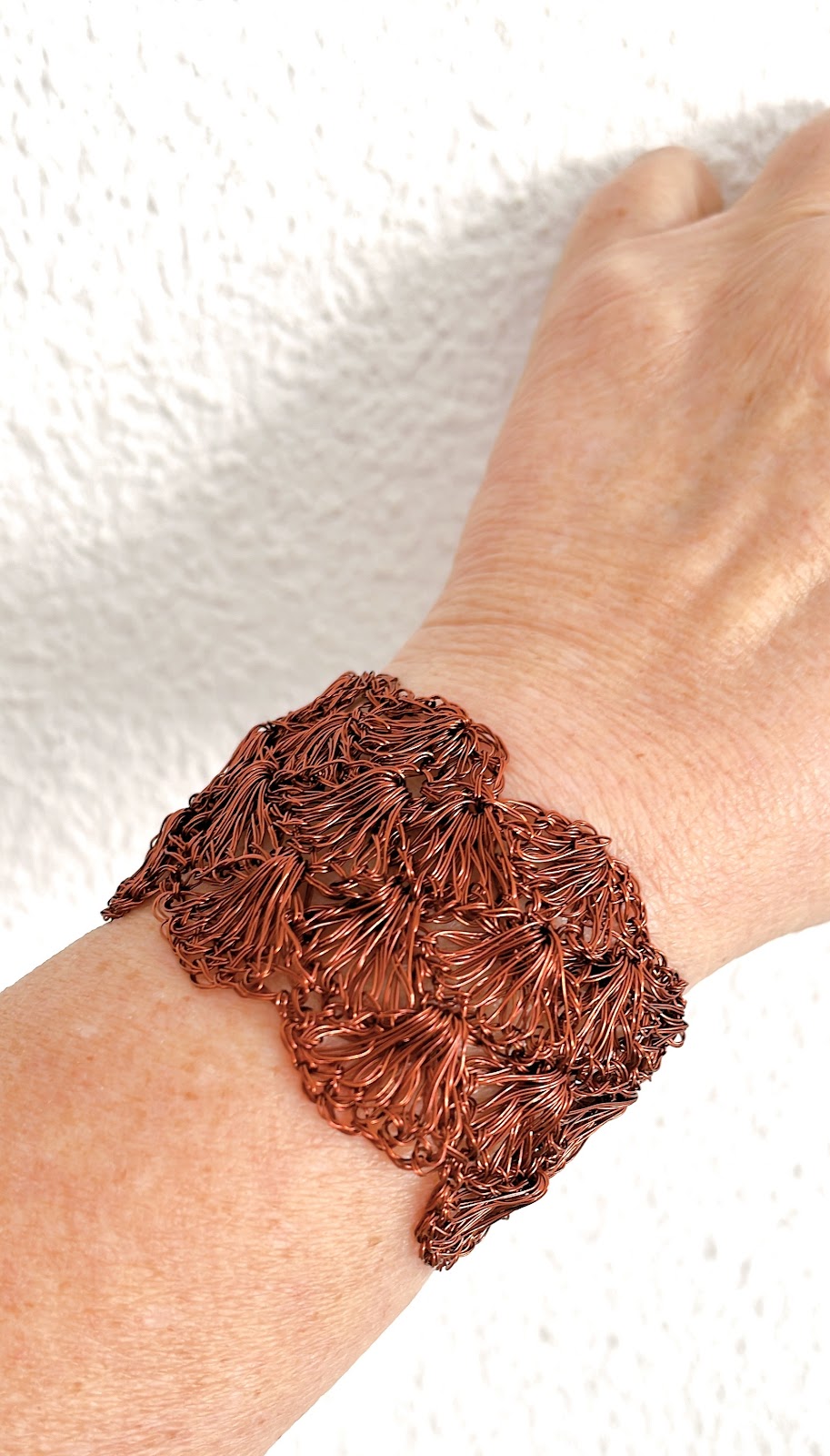 Su textura firme y natural conecta con lo esencial, con lo eterno. Brazalete tejido a mano en cobre puro. Cada nudo evoca la energía vital que asciende desde la tierra, con un diseño que abraza la muñeca como una forma orgánica en expansión.