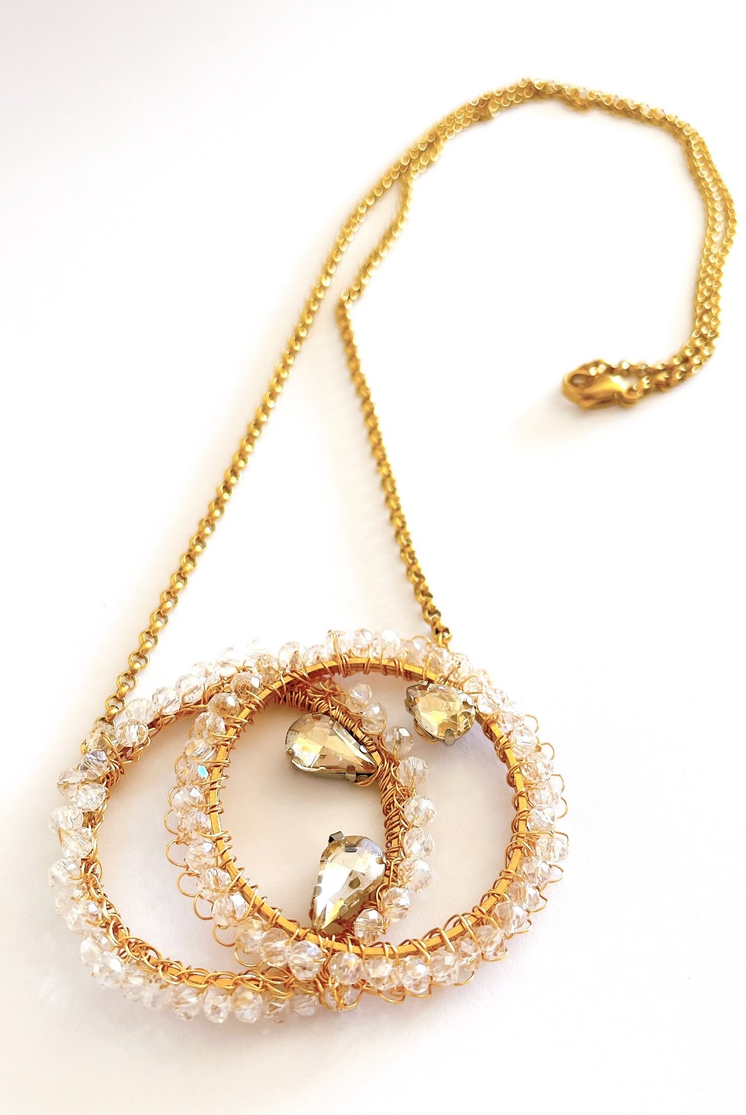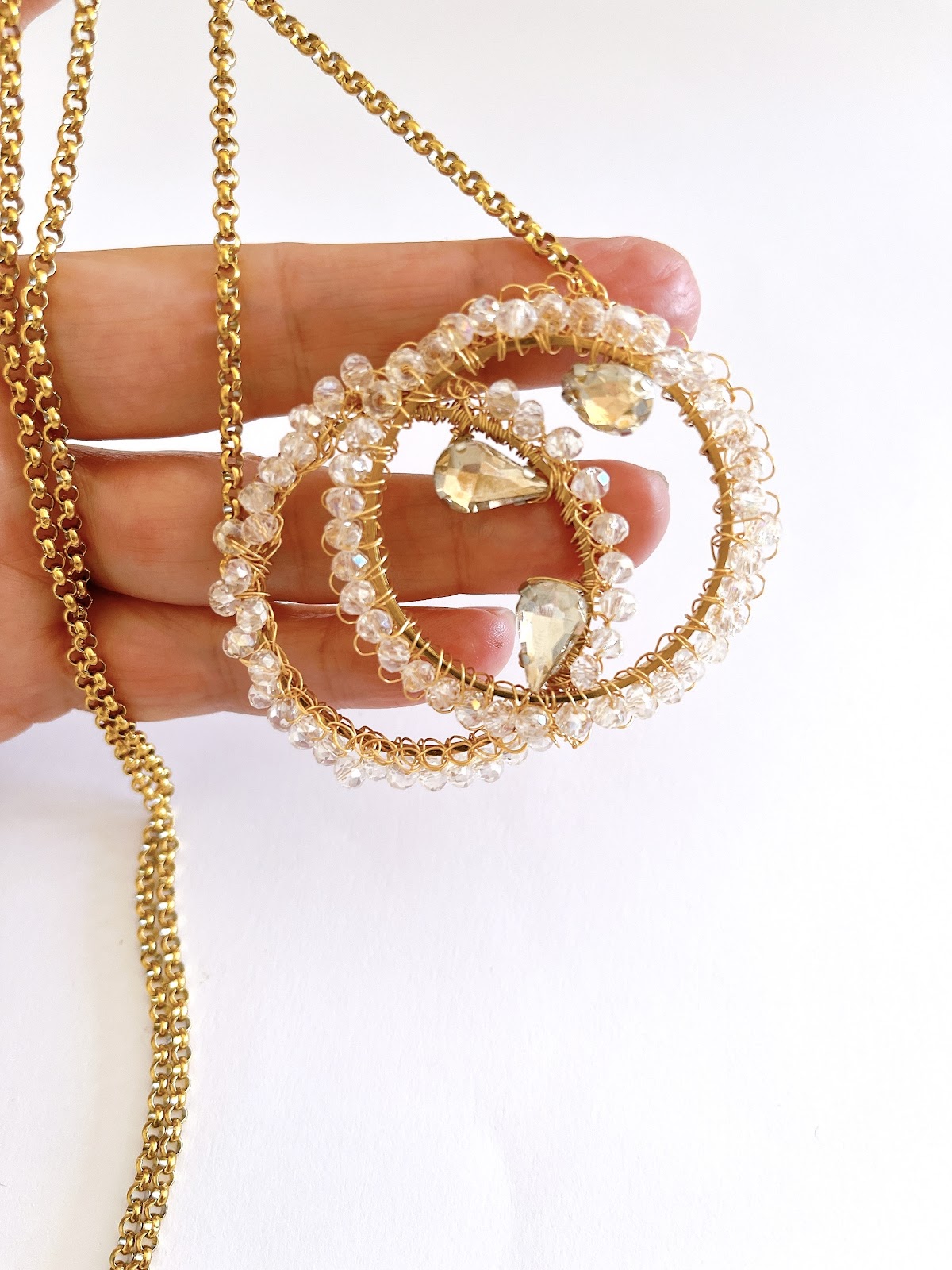 Colgante doble tejido a mano con alambre de cobre relleno de oro de 14K, bordeado con cristales transparentes que capturan la luz como gotas de rocío. En su interior, tres lágrimas de cristal cuelgan suspendidas como pequeños destellos flotando en el tiempo.