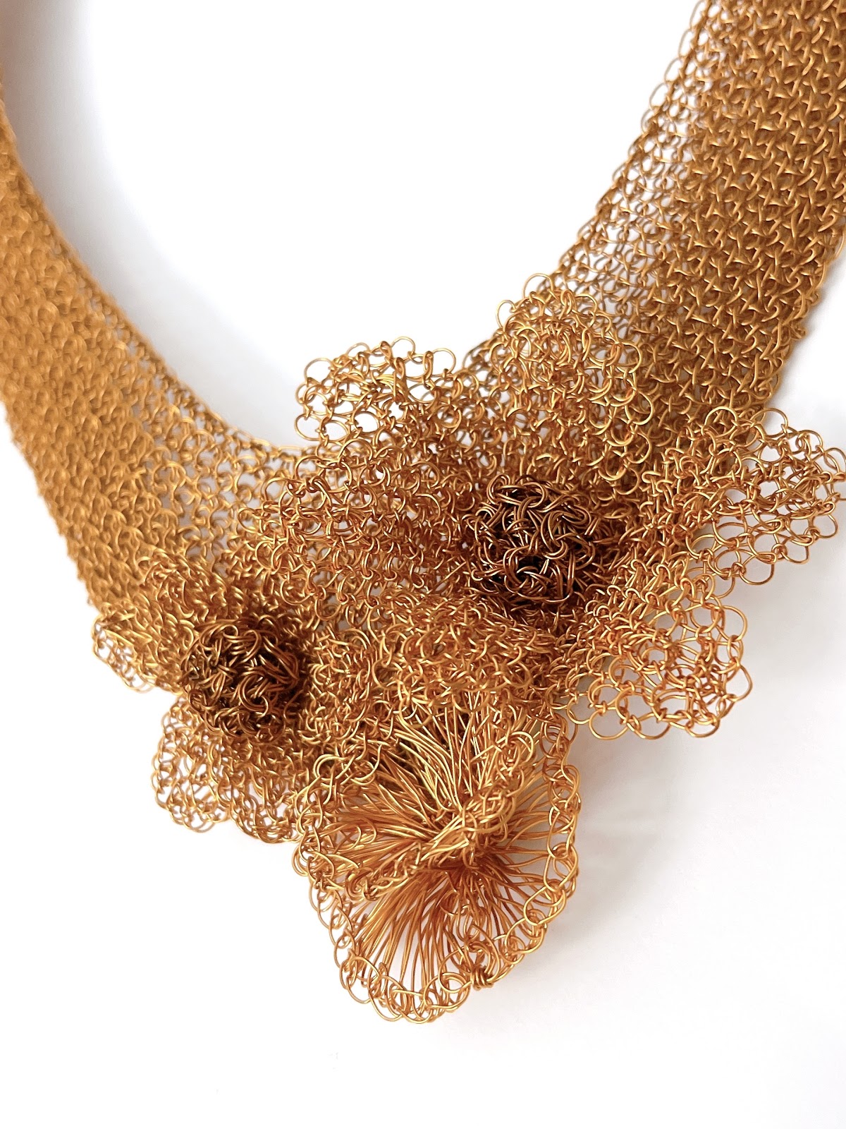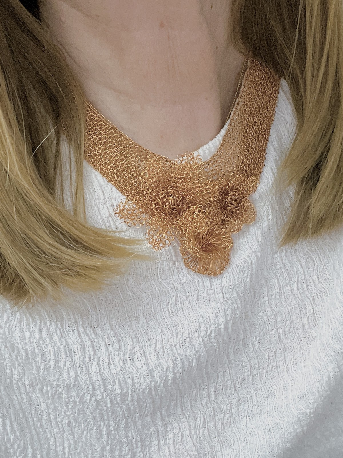 Gargantilla tejida completamente a mano con alambre de cobre, una pieza que envuelve el cuello con la calidez del metal vivo y la fluidez del tejido. Las flores tejidas en el centro emergen como una danza orgánica de luz y movimiento, capturando la energía del cobre en su forma más expresiva.