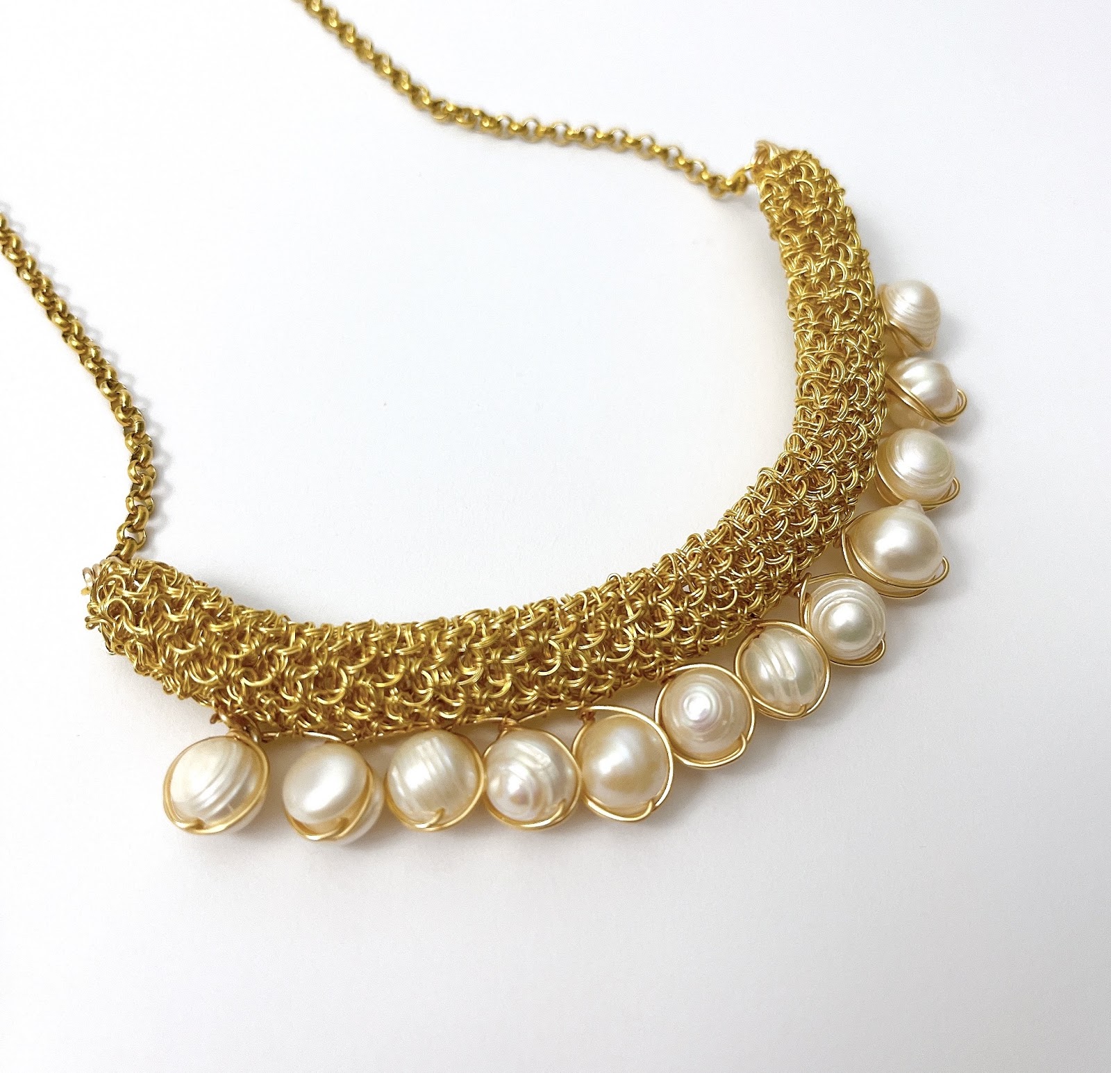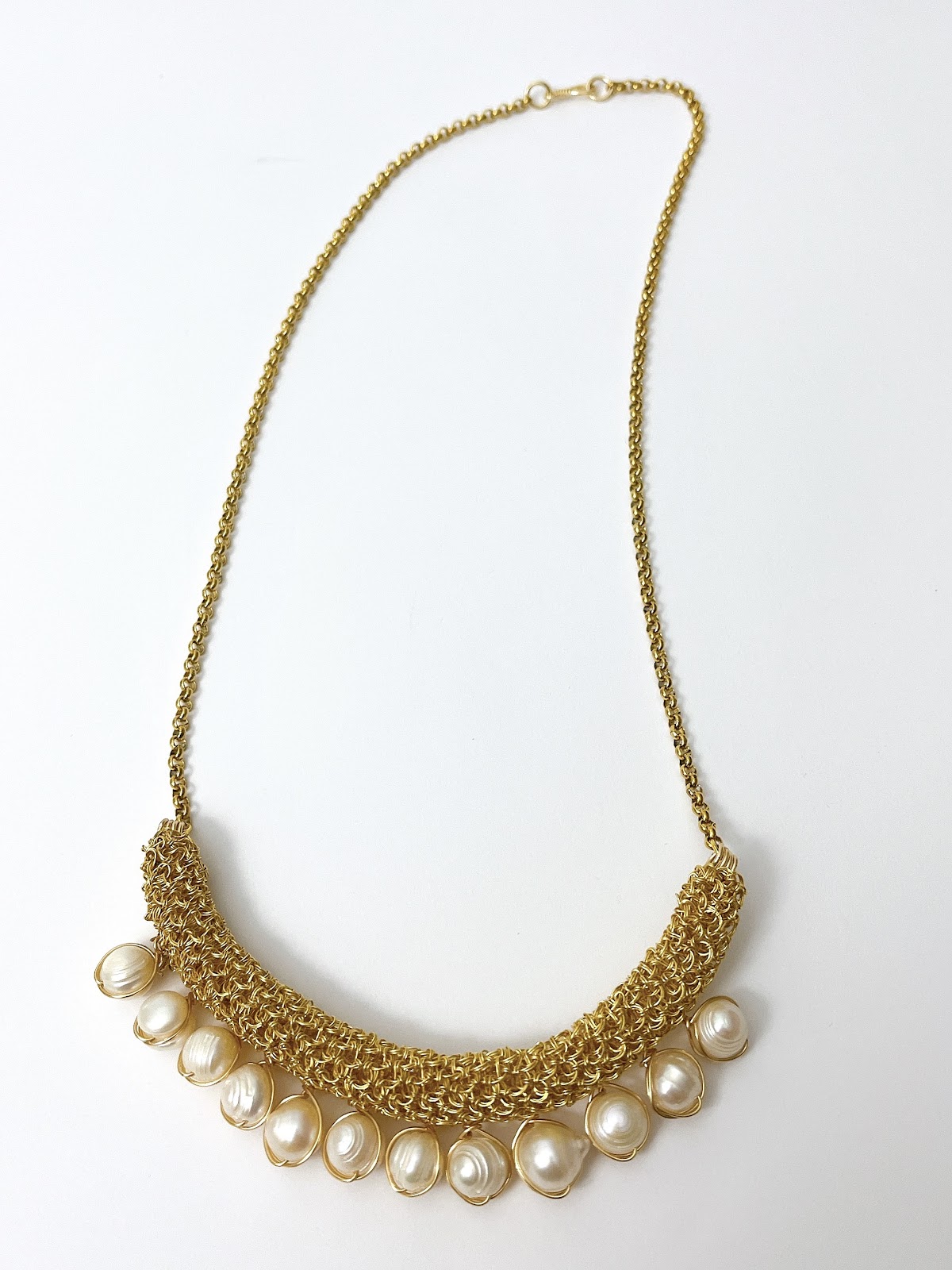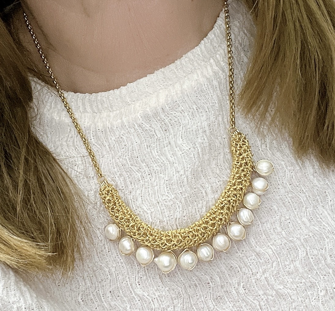 Un collar tejido a mano con alambre de cobre con baño de oro de 14K, donde la suavidad del entramado abraza delicadamente una hilera de perlas naturales de río. Cada perla, con su brillo nacarado y formas únicas, aporta una elegancia orgánica y serena, promueven la serenidad interior, equilibran las emociones y atraen energías armoniosas a quien las lleva.