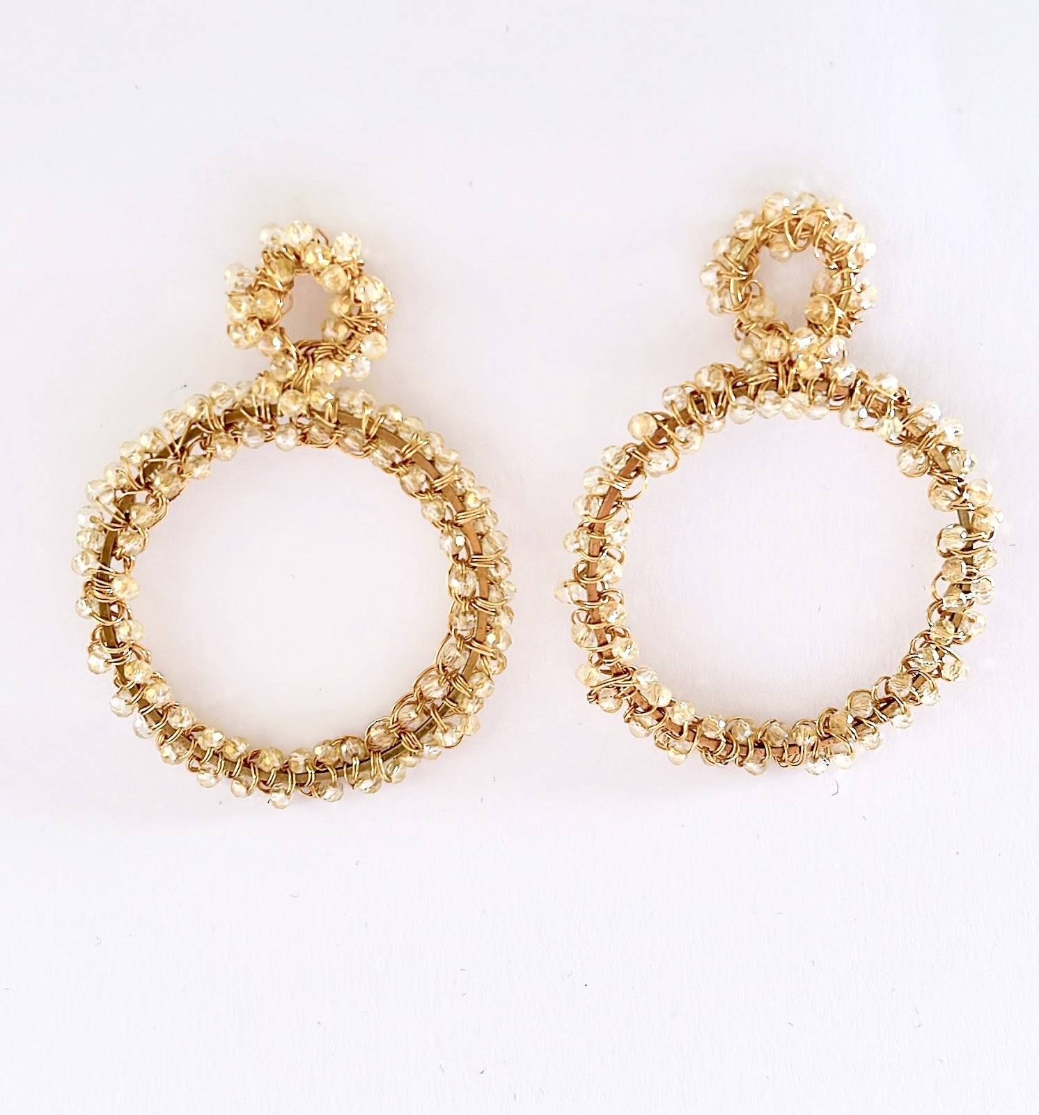 Un diseño versátil que combina elegancia clásica con trabajo artesanal. Pendientes tejidos a mano con cristales que envuelven un círculo dorado en total armonía.