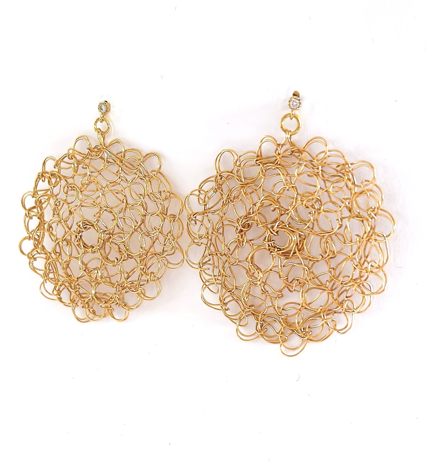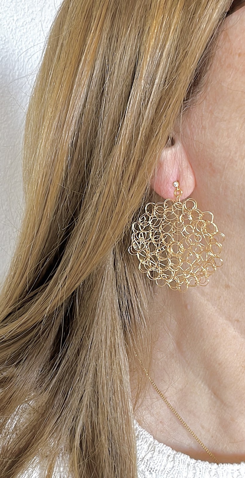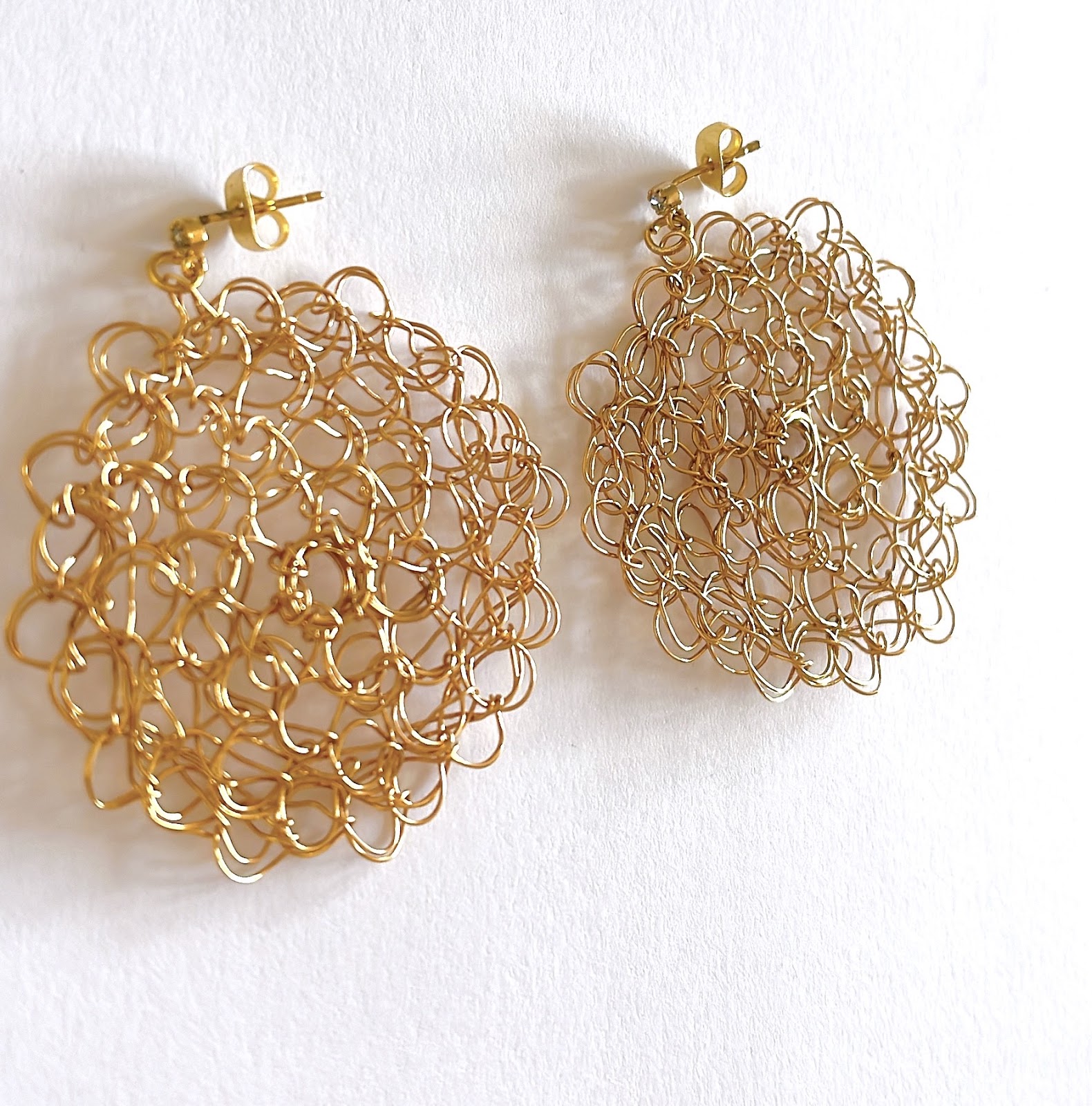 Pendientes tejidos a mano que evocan una aureola luminosa en movimiento.