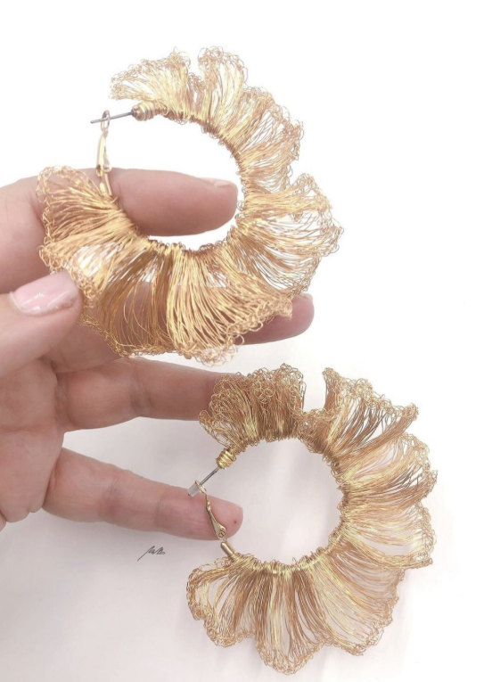 Pendientes tejidos a mano con una técnica artesanal cuyas características son únicas y diferentes, evocando el vuelo suave de un pétalo en movimiento.