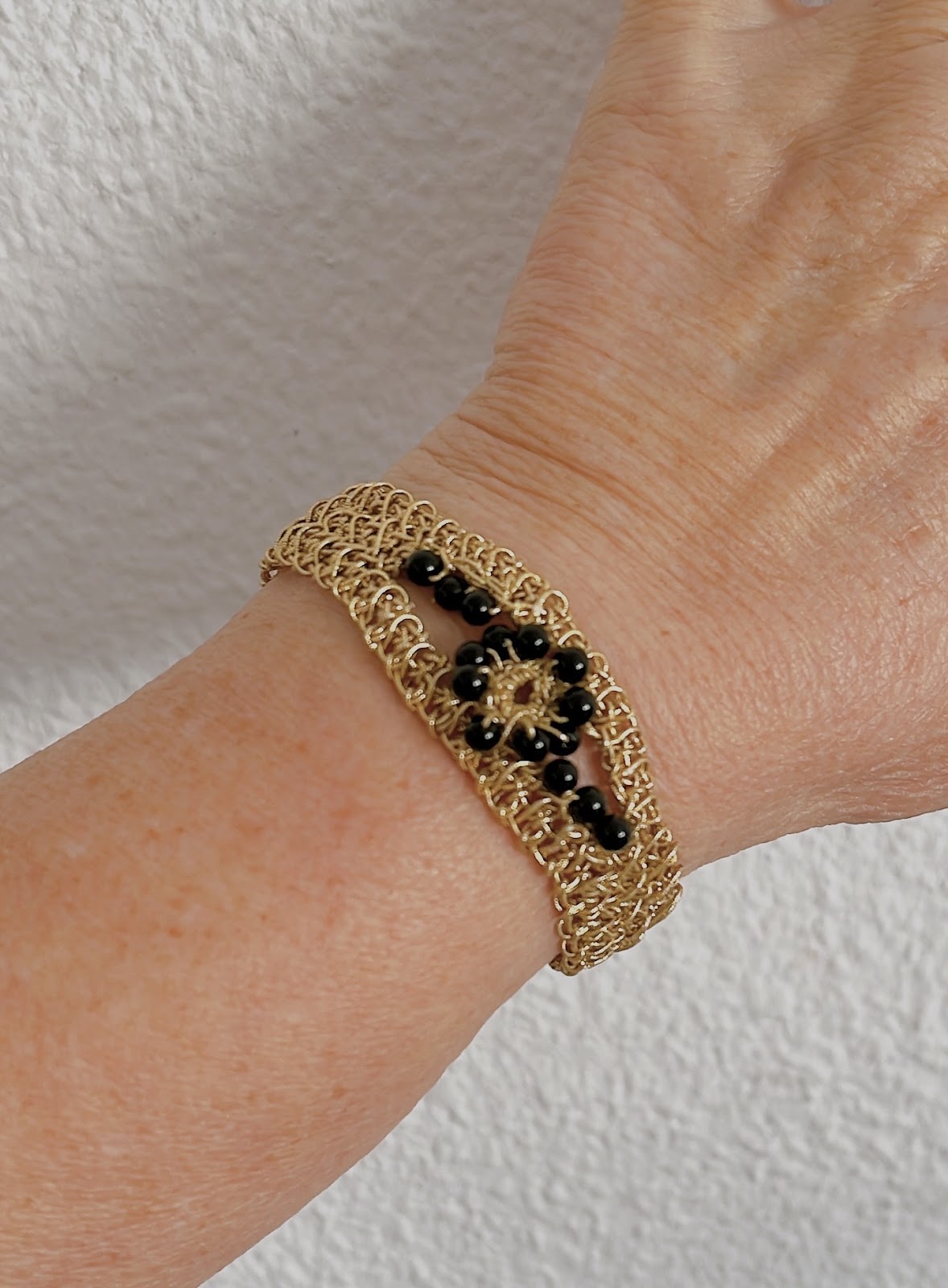 Diseñado para acompañarte en momentos especiales o cotidianos con distinción. Este brazalete combina la delicadeza del tejido a mano con la fuerza del contraste entre el dorado y el negro. Cada cuenta fue incorporada con precisión para formar un dibujo central con carácter y elegancia.