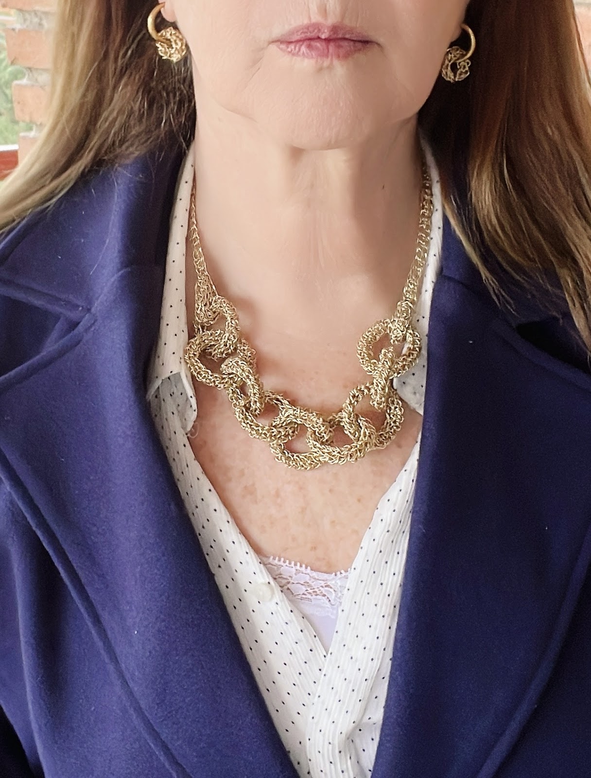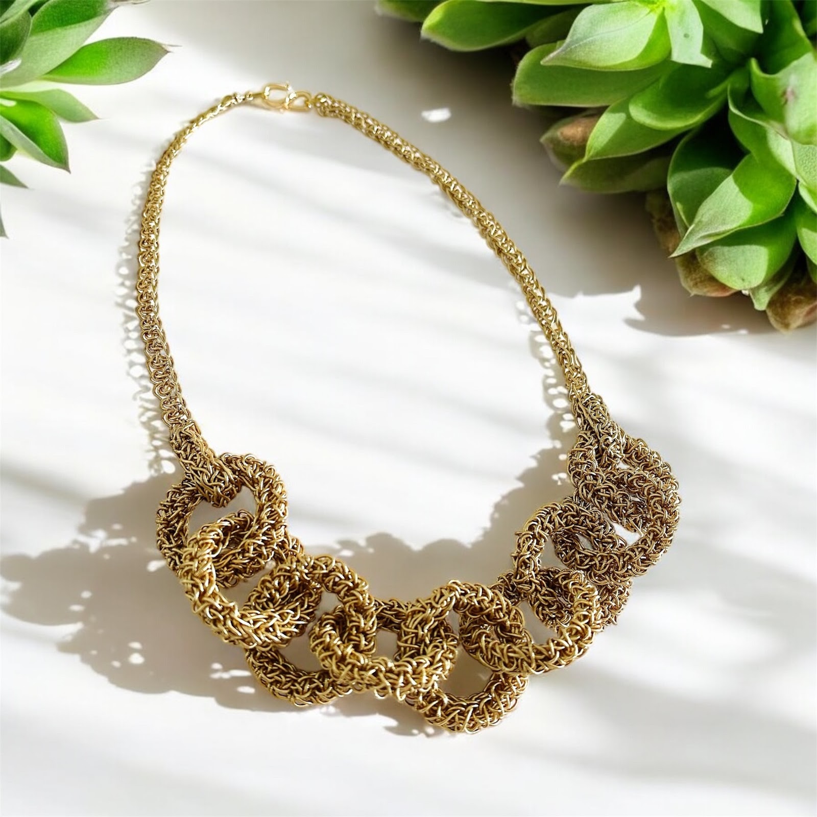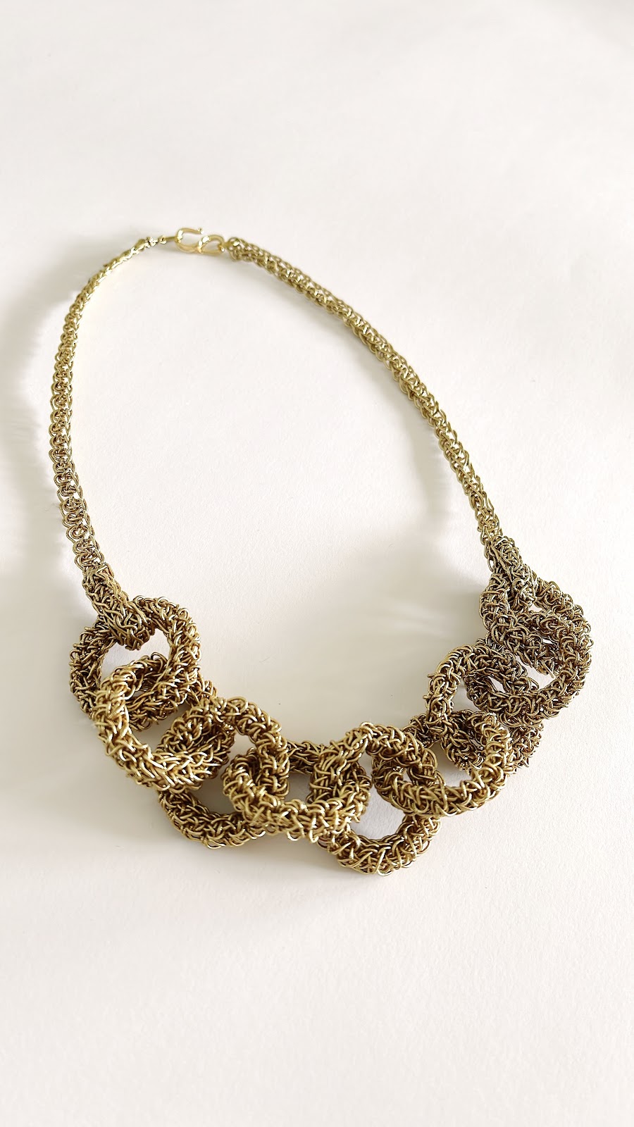 Collar tejido a mano con hilo de algodón italiano con lame dorado, compuesto por eslabones orgánicos que se entrelazan como símbolos de conexión y fuerza interior.