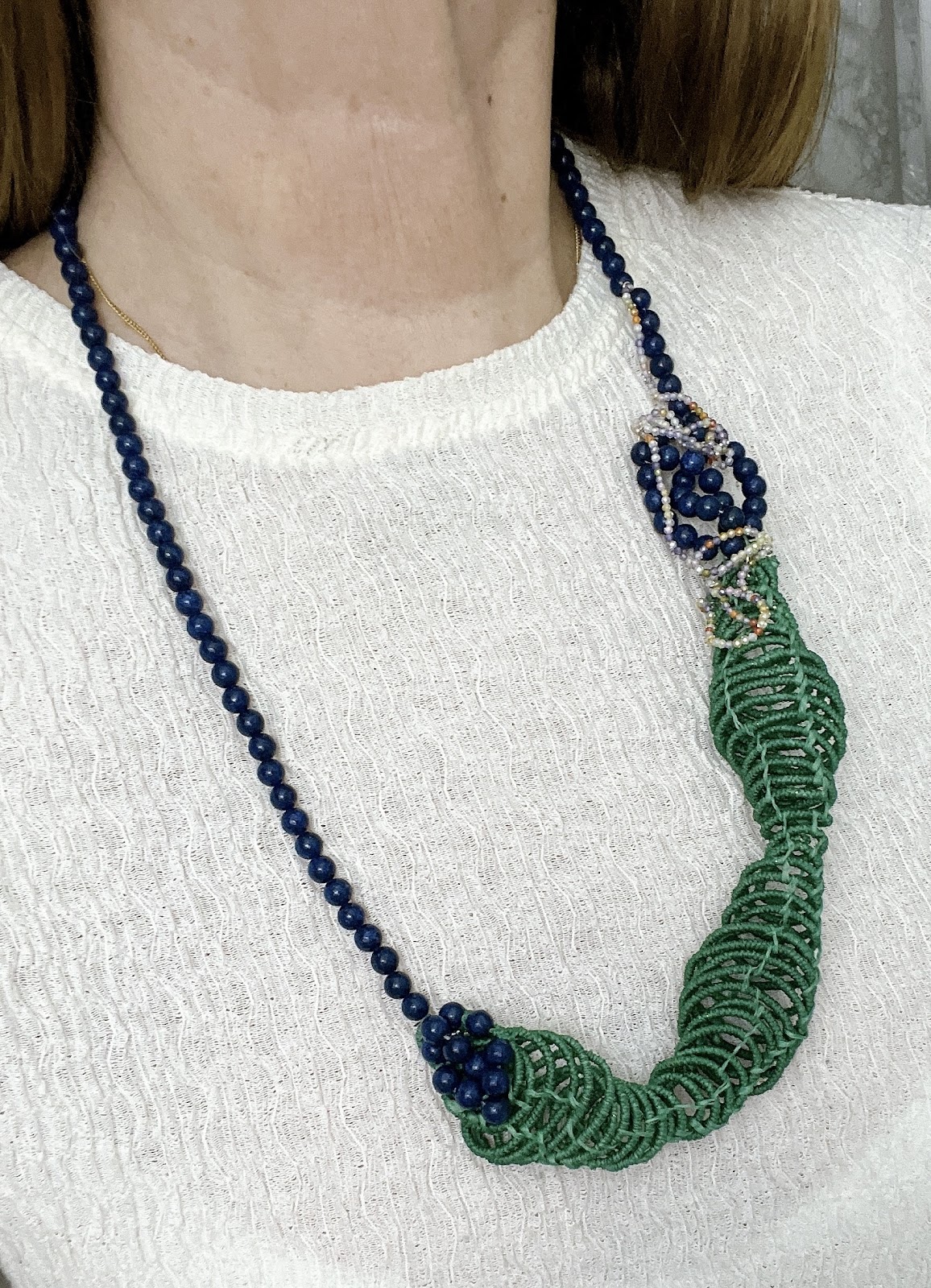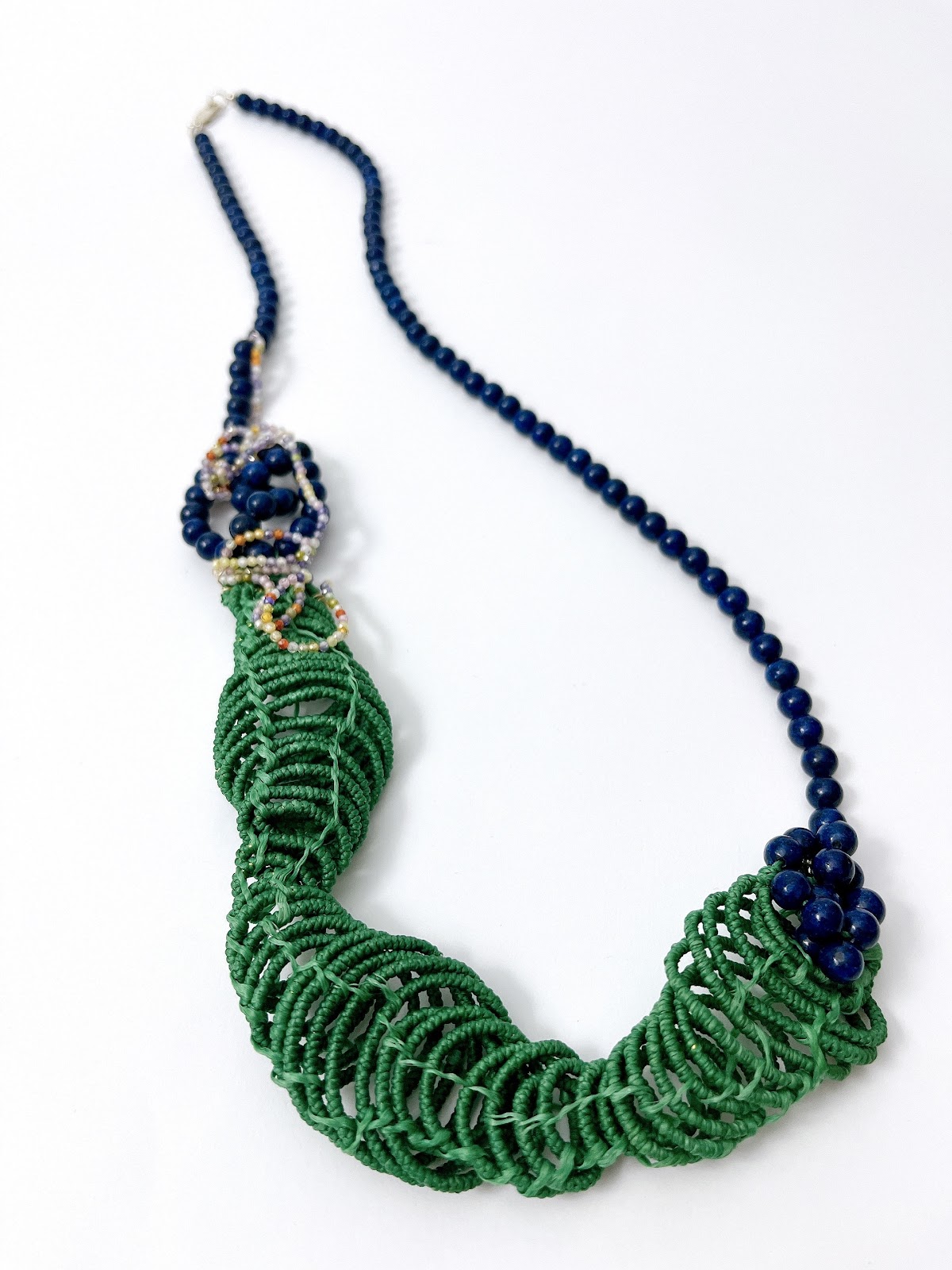 La estructura verde, tejida con la técnica de coiling en distintos diámetros, recuerda las formas de la vegetación viva, envolviendo con suavidad las gemas de ágatas azules y los cristales circonitas en diferentes tonos.