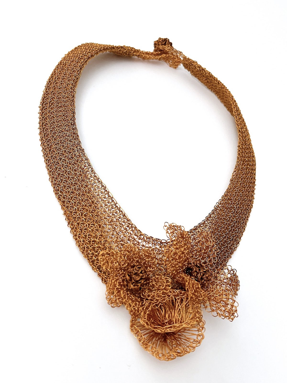 Gargantilla tejida completamente a mano con alambre de cobre, una pieza que envuelve el cuello con la calidez del metal vivo y la fluidez del tejido. Las flores tejidas en el centro emergen como una danza orgánica de luz y movimiento, capturando la energía del cobre en su forma más expresiva.